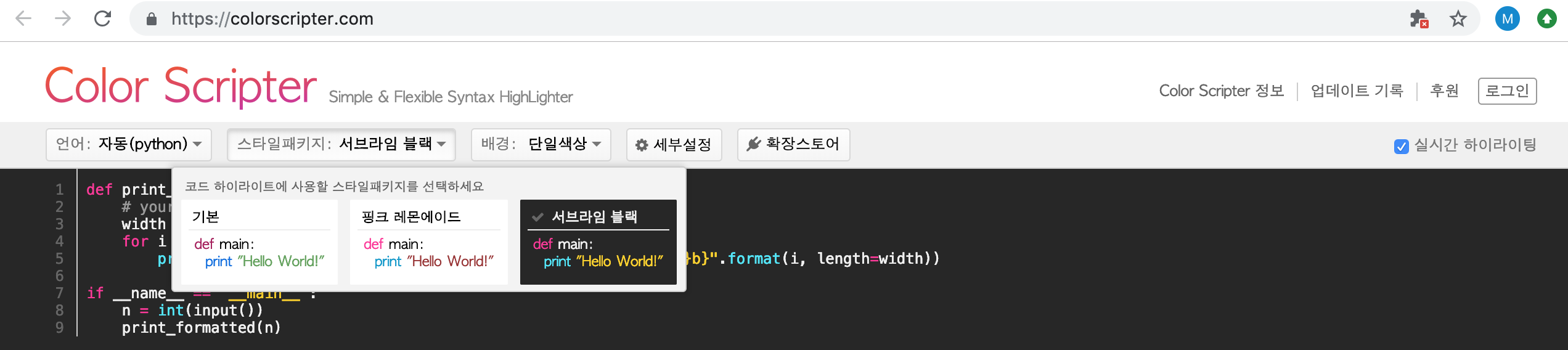 Java, JavaScript, JSP, Python, Ruby, SQL, Swift, Visual Basic, Action Script, ASP, C, C#, CSS, HaXe, HTML, Objective C, Perl, PHP 등 다양한 프로그래밍 언어를 지원하고 기본, 핑크 레몬레이드, 서브라임 블랙 스타일을 지원하고 있네요.