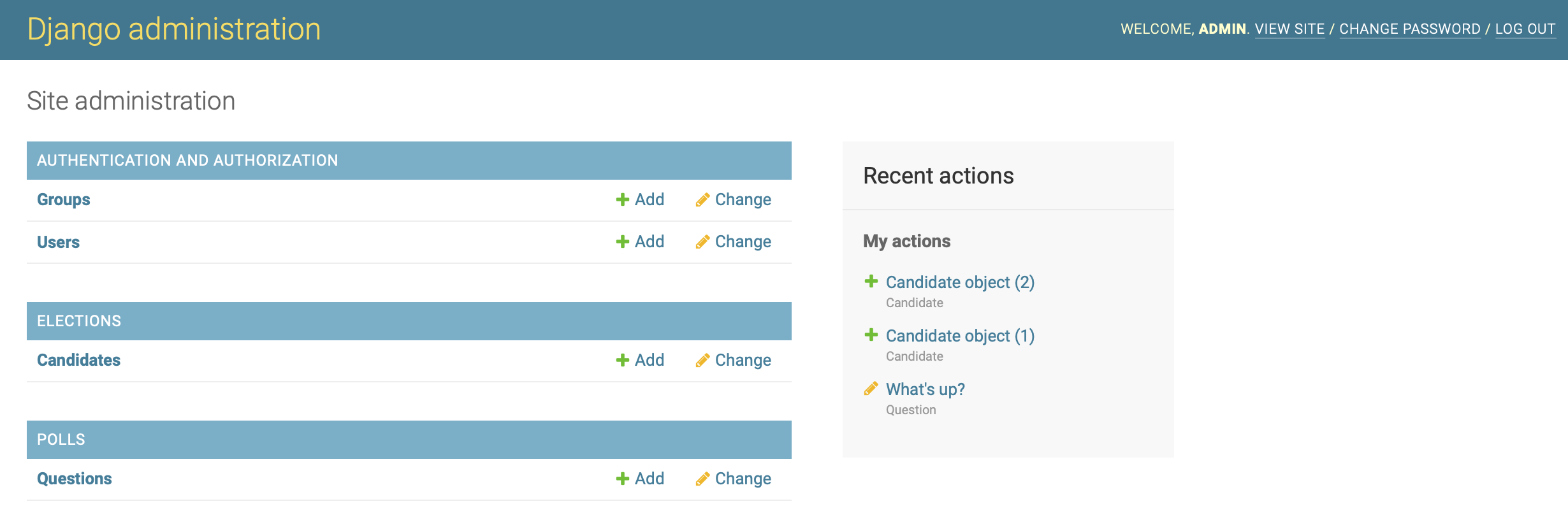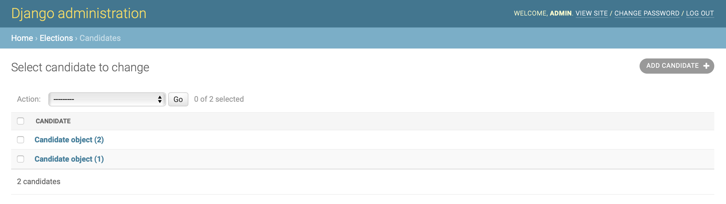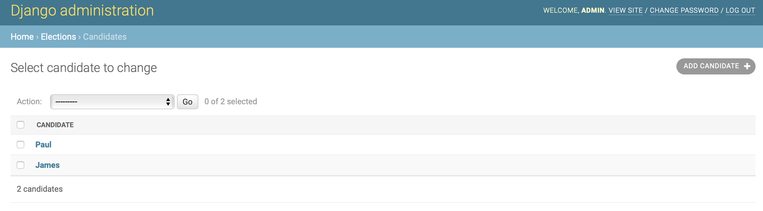 1234567891011from django.db import models# Create your models here.class Candidate(models.Model):name = models.CharField(max_length=10)introduction = models.TextField() # no limit of lengarea = models.CharField(max_length=15)party_number = models.IntegerField(default=1)def __str__(self):return self.name7. admin page 재확인합니다.