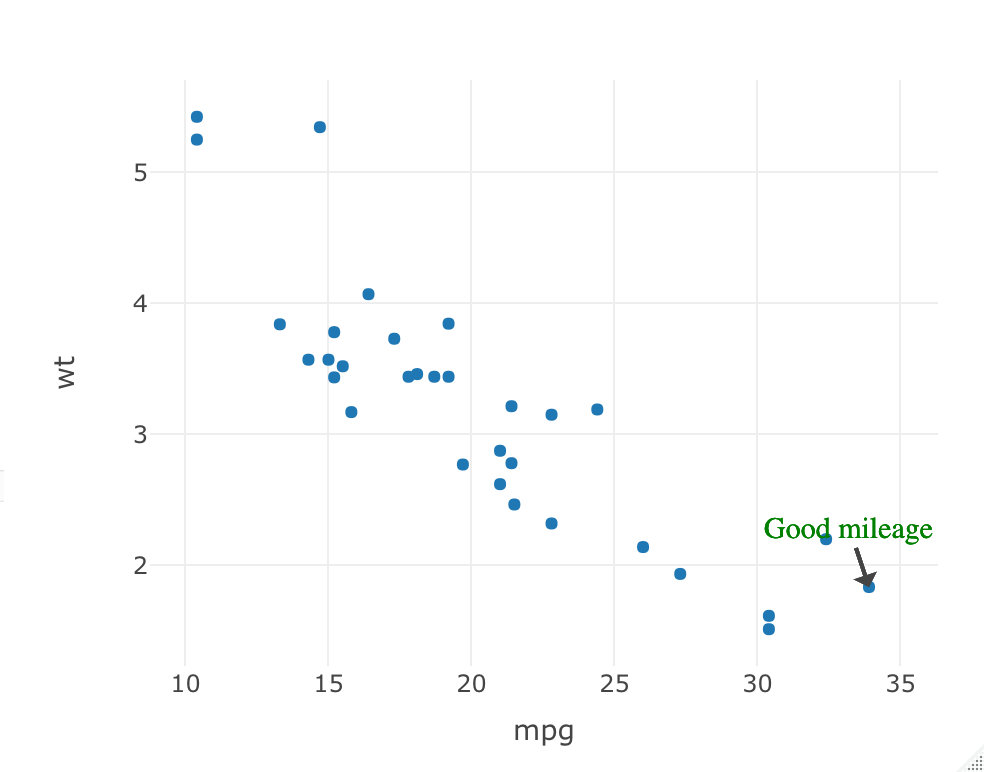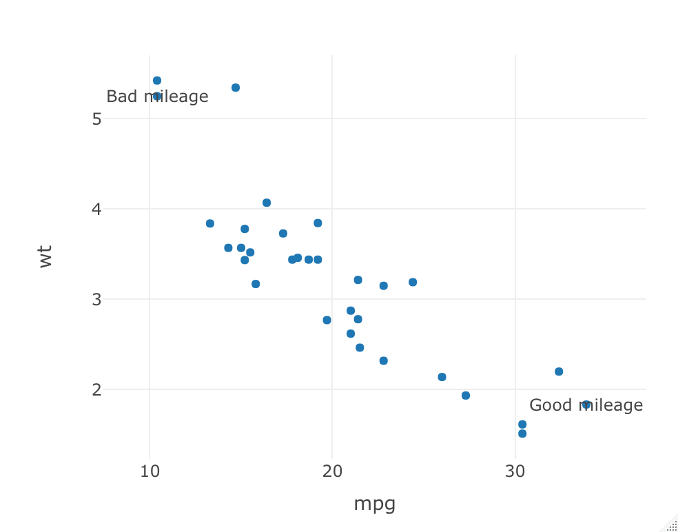 ### Add Multiple annotations to the plot - add_annotations() function syntax ### Example of annotations on a single data points ### ### Display annotations for good and bad mileage plot_ly(data=mtcars, x = ~mpg, y = ~wt, type='scatter', mode='markers') %>% add_annotations(x = mtcars$mpg[which.max(mtcars$mpg)], y = mtcars$wt[which.max(mtcars$mpg)], text="Good mileage", showarrow=F)%>% add_annotations(x = mtcars$mpg[which.min(mtcars$mpg)], y = mtcars$wt[which.min(mtcars$mpg)], text="Bad mileage", showarrow=F)