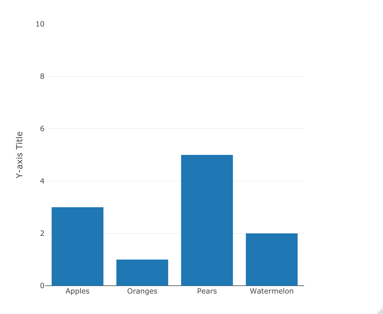 ### Set the range of Y axis yaxis <- list( title = 'Y-axis Title', #ticktext = list('long label','Very long label','3','label', "what", "The", "Seven"), #tickvals = list(1, 2, 3, 4, 5, 6, 7), #tickmode = "array", range=list(0,10) #automargin = TRUE, #titlefont = list(size=30) ) plot_ly(x = c('Apples', 'Oranges', 'Watermelon', 'Pears'), y = c(3, 1, 2, 5), width = 500, height = 500, type = 'bar') %>% layout(yaxis = yaxis)