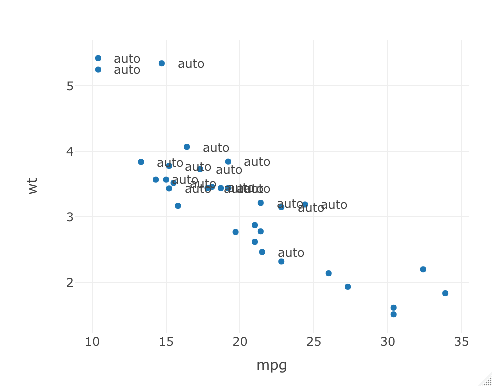 ### Example #2 of annotations on multipile data points #### # Display annotations for automatic transission cars plot_ly(data=mtcars, x = ~mpg, y = ~wt, type='scatter', mode='markers') %>% add_annotations(x = mtcars$mpg[mtcars$am == 0]+2, y = mtcars$wt[mtcars$am == 0], text="auto", showarrow=F)