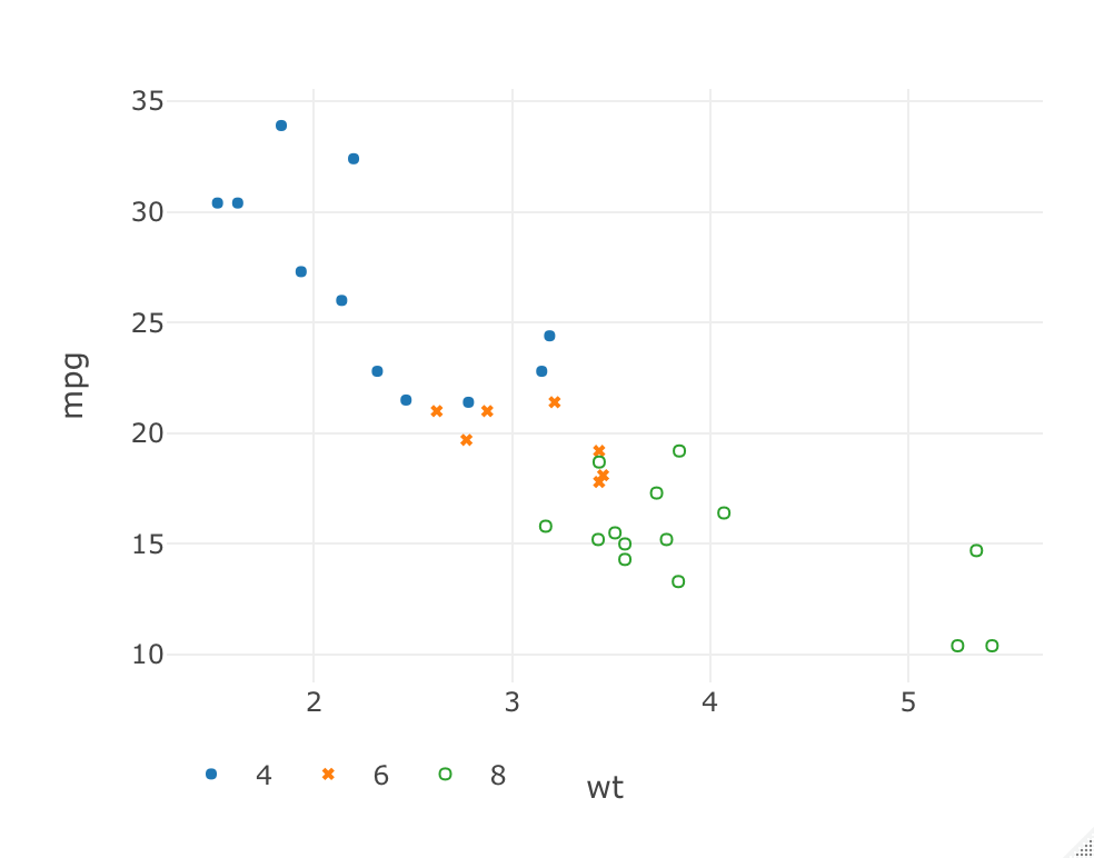plot_ly(data=mtcars, x = ~wt, y = ~mpg, type ='scatter', mode = 'markers', symbol = ~as.factor(cyl), symbols = c('circle', 'x', 'o'), marker = list(size=5)) %>% layout(legend=list(orientation='h'))