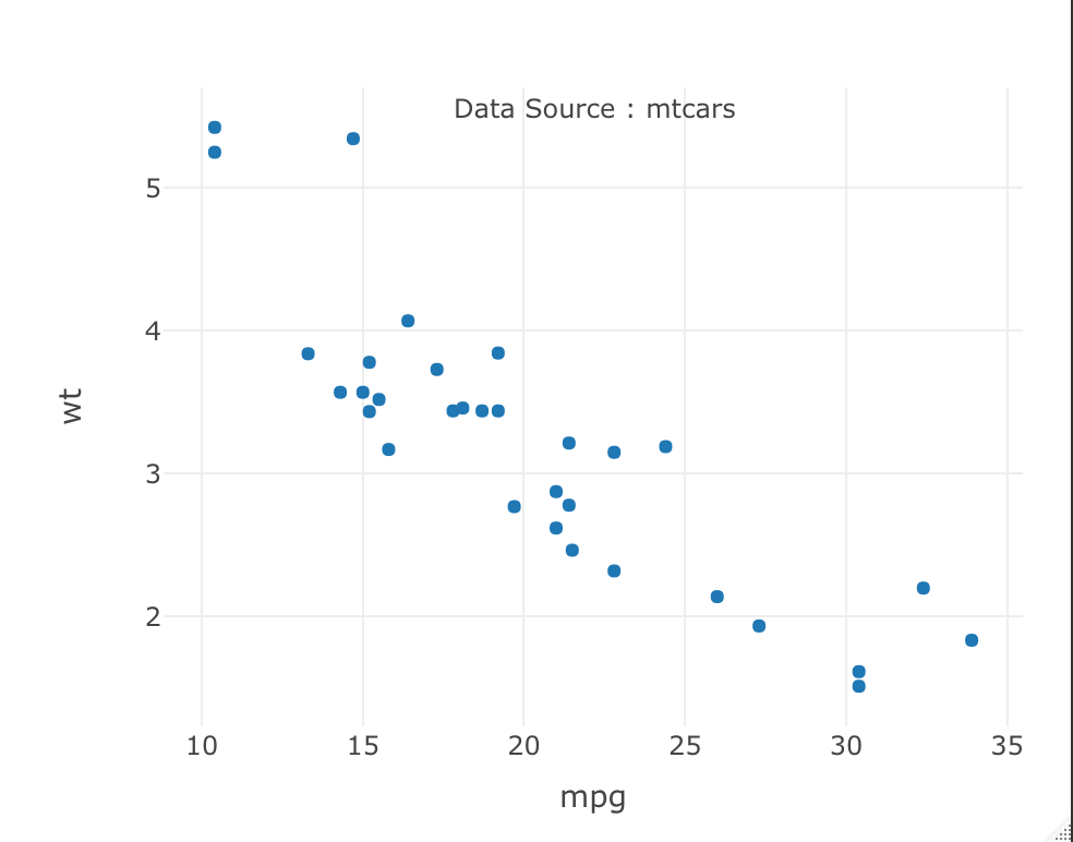 ### Example of annotations - placing text a a desired location on the plot ### ## Display Data Source ### Demo of x/y ref as 'paper' plot_ly(data=mtcars, x = ~mpg, y = ~wt, type='scatter', mode='markers') %>% add_annotations(xref="paper", yref="paper", x = 0.5, y = 1, text="Data Source : mtcars", showarrow=F)