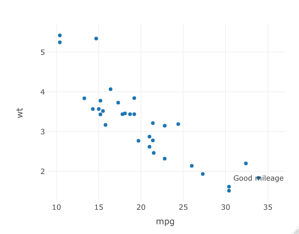 ### Add annotations to the plot - add_annotations() function syntax ### Example of annotations on a single data points ### ### Display annotations for good mileage plot_ly(data=mtcars, x = ~mpg, y = ~wt, type='scatter', mode='markers') %>% add_annotations(x = mtcars$mpg[which.max(mtcars$mpg)], y = mtcars$wt[which.max(mtcars$mpg)], text="Good mileage", showarrow=F)