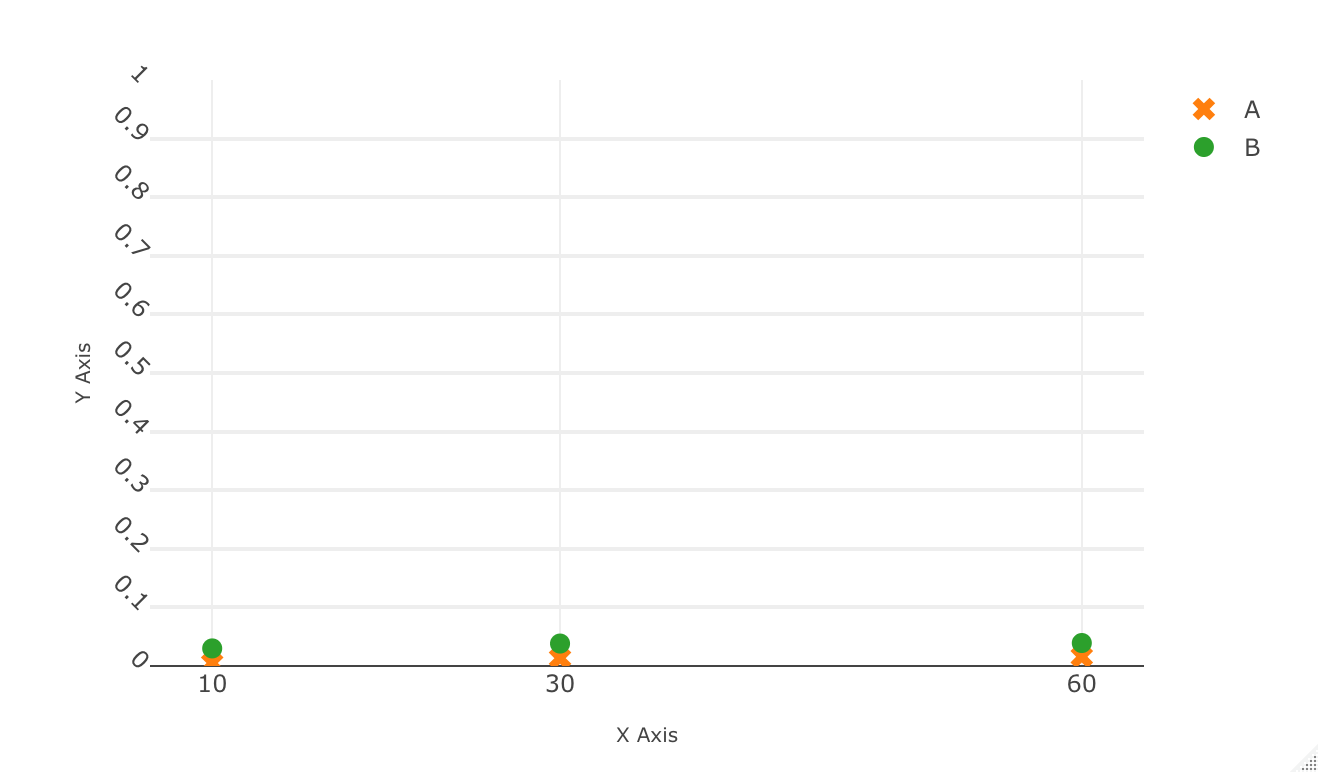 ### Set the range of scale at axis ## Disable autoscale according to the x or y-axis data xaxis <- list( title = 'X Axis', ticktext = list('10','30','60'), tickvals = list("10", "30", "60"), tickmode = "array", titlefont = list(size=10) ) yaxis<-list( title = 'Y Axis', tick0 = 0, dtick = 0.1, tickangle = 45, gridwidth = 2, fixedrange=T, range= c(0, 1), autosize=T, titlefont = list(size=10) ) short_drop = list(0.005, 0.0133, 0.0158) short_wait = list(0.03, 0.0383, 0.0392) long_drop = list(0.45, 0.8517, 0.9642) long_wait = list(0.255, 0.7683, 0.9892) x_data = list("10", "30", "60") plot_ly (type='scatter', mode='markers') %>% add_trace(x= x_data,y = short_drop, name = "A", marker=list(symbol="x", size=10) ) %>% add_trace(x= x_data, y = short_wait, name = "B", marker=list(size=10) ) %>% layout(xaxis = xaxis, yaxis=yaxis)