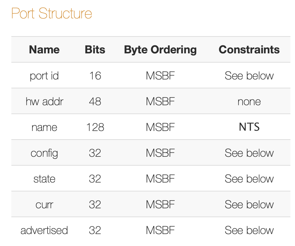 Each port structure refers to a single port on the OpenFlow switch. This port is identified by the port id, with several reserved ones for special ports (Max, Flood, Controller, etc). The hw addr is the link layer address associated with the port, for inst