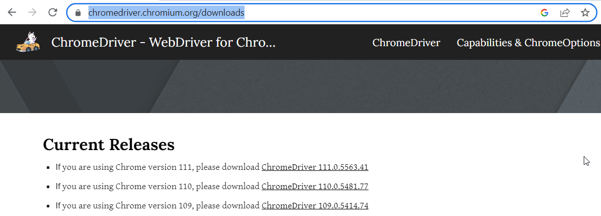 Current Releases If you are using Chrome version 111, please download ChromeDriver 111.0.5563.41 If you are using Chrome version 110, please download ChromeDriver 110.0.5481.77 If you are using Chrome version 109, please download ChromeDriver 109.0.5414.74