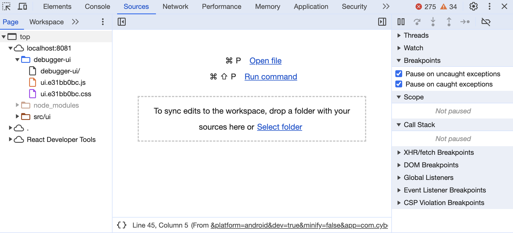 애뮬레이터에서 어플리케이션 동작 및 기능을 검증하는 과정에서 자주 경고 문구나 에러 메세지를 마주하게 된다. 디버깅 기능을 통해 콜스택을 확인할 수 있고 문제가 되는 코드가 내가 작성한 라인이면 바로 수정이 가능하겠지만 때로는 콜스택이 리액트 라이브러리 내부에서 발생하는 경우에는 디버깅이 어려워 질수 있다. 다행히 리액트에서는 아래 화면과 같이 예외 경우가 발생할 경우 동작을 일시 정지하여 문제되는 코드를 바로 확인할 수 있다. 이는 'Pause on uncaught exceptions' 과 'Pause on caught exception'을 활성화 시킨 후 확인할 수 있다.